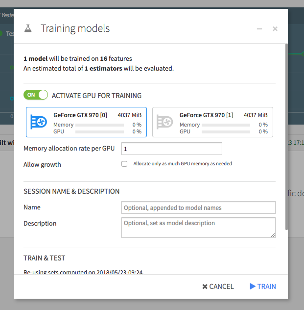 If your DSS instance has access to any GPU resource(s), you can opt to train the model on a selection of these when you click ‘TRAIN’.