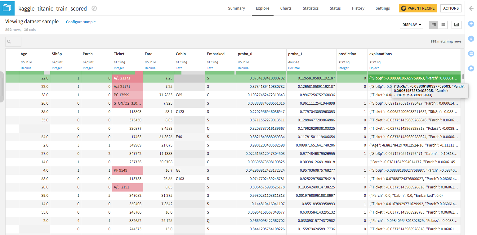 Running the scoring recipe outputs the predictions and an explanations column. The explanations column contains a JSON object with features as keys and computed influences as values, and can easily be unnested in a subsequent preparation recipe.