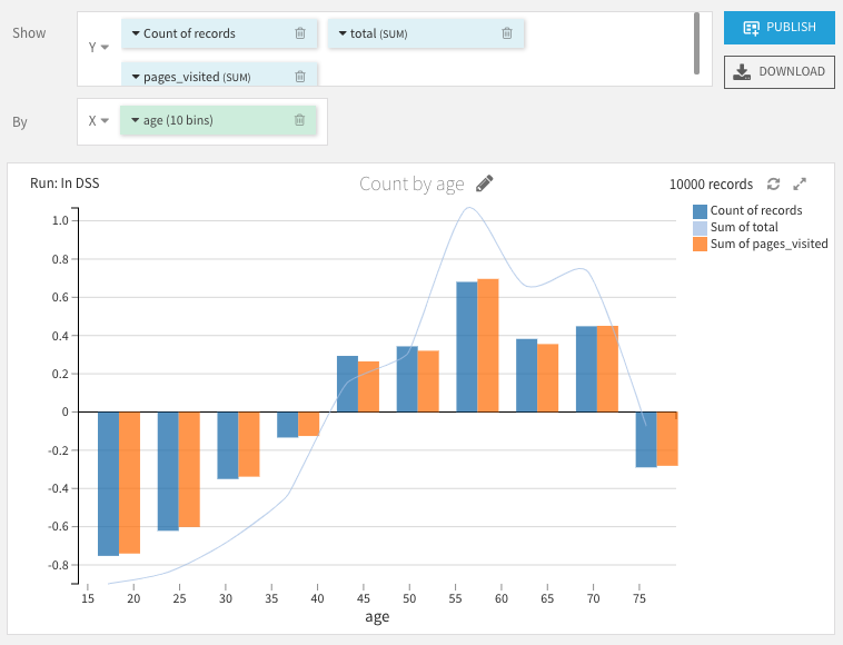 The Histogram layout puts the binning column on the X axis, the summary column on the Y axis, and creates separate bars for each subgroup for each bin.