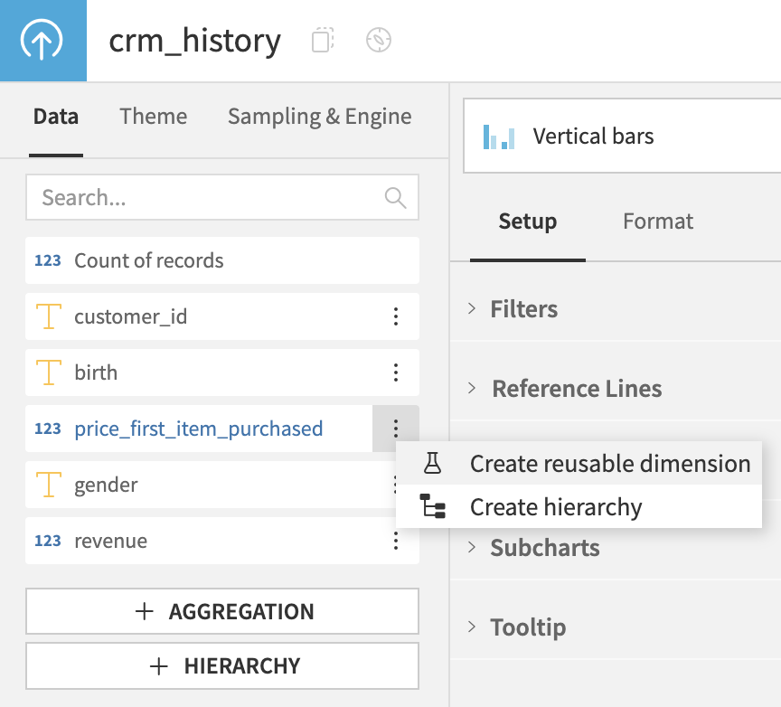 Hierarchies can be created using the button located in the footer of the list of dataset columns, as well as from the three-dot column menu.